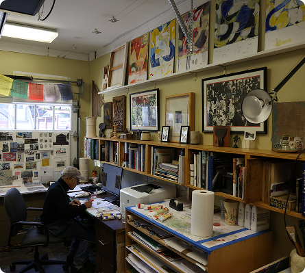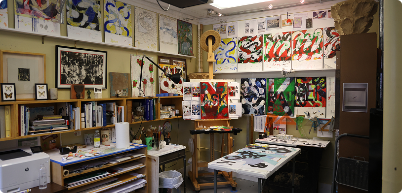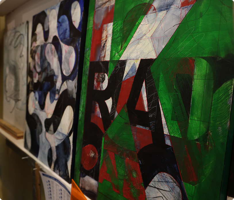 In the studio I use memories of the places and things I encounter to start compositions by making gestural marks, scribbles and shapes with pencils.