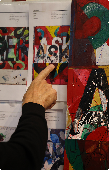 During the process of creating paintings, I will often take progress photographs of the pieces at various stages in their development. I create miniature studies of the paintings by printing the photographs on 8-1/2 x 11 paper. Using acrylic paint and ballpoint pens I will add new colors and shapes onto the photographs, experimenting with options to resolve the image or create alternative transformations, allowing the painting to be taken in a new direction. Quite often, one painting will inspire the next. The evolution of and unexpected changes to one piece will become the starting points for a new composition.